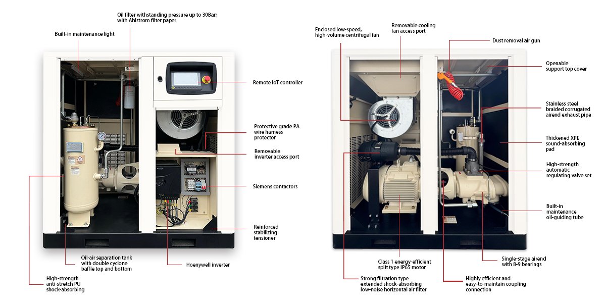 KLINA rotary screw compressors are designed for easy maintenance, featuring a built-in maintenance light, removable access ports for the inverter and cooling fan, an openable top cover, and a dust removal air gun.