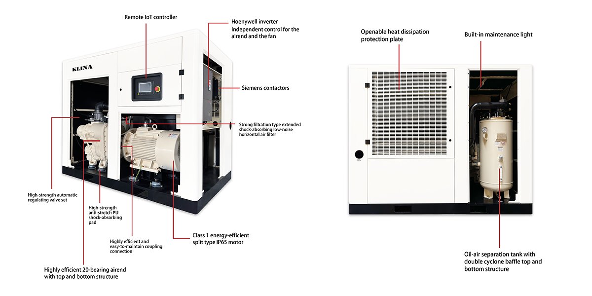 KLINA rotary screw compressors are designed for easy maintenance, featuring a built-in maintenance light, removable access ports for the inverter and cooling fan, an openable top cover, and a dust removal air gun.