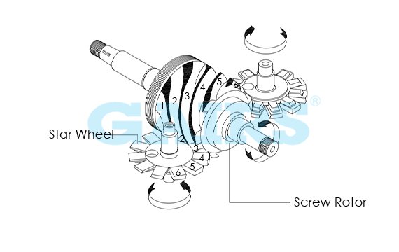 Another key feature of the single screw air end is the friction dynamics between the screw groove and the star wheels. The friction force is parallel to the atmospheric force acting on the star wheels, preventing the atmospheric force from affecting the friction. This unique design is crucial for establishing dynamic lubrication, which is the main factor behind the star wheel’s long service life.